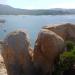 Alla fine raggiungiamo questa caletta riparata: finché il vento non cala staremo qui. Anche sostare su questa spiaggia è un'attività avventurosa: sopra c'è un campo da golf ed ogni tanto piovono palline! (Panorama di 3 foto unite, come sempre cliccate sulla foto per vederla a dimensione piena) -
