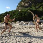 Facciamo una simpatica passeggiatina sulla spiaggia nella zona delle grotte, dove un gruppetto di anglosassoni sta accampato per arrampicare le famose pareti di Cala di Luna (lo vedete quello appeso proprio al centro?)