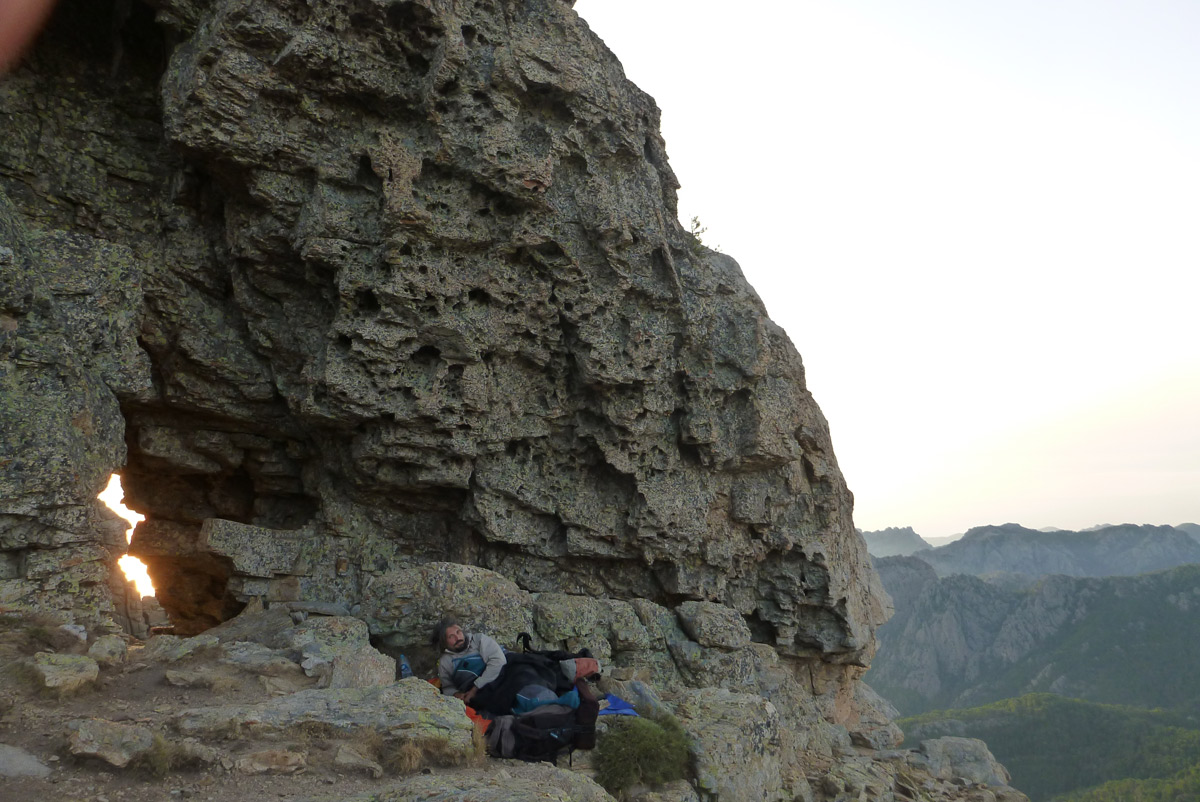Dormiremo qui, presso questo piccolo arco di pietra, in uno dei pochissimi punti piatti in cui si può posare un paio di saccappeli. Il vento è forte e ci imbacucchiamo come possiamo.
