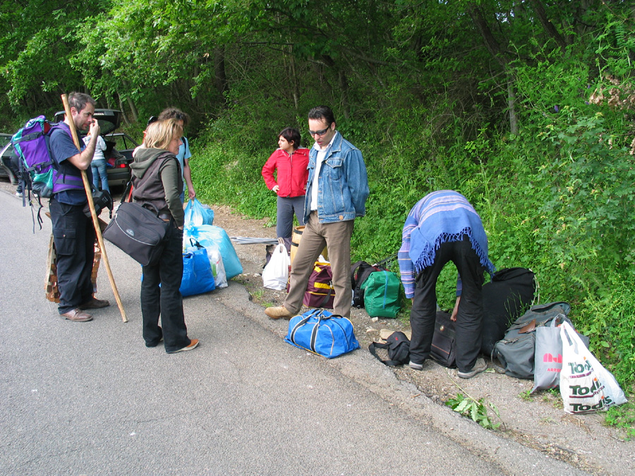 Parked the cars, we had to carry lot of stuff across the wood to reach the location.